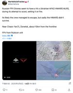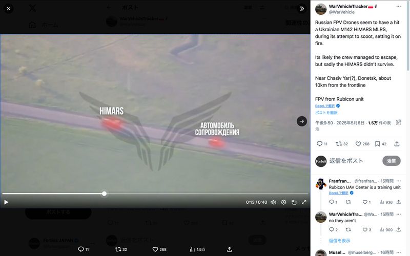 ロシア軍の最精鋭ドローン部隊が、ウクライナ軍の米国製高機動ロケット砲システム(HIMARS)の装輪式発射車両を撃破(Xのスクリーンショット)