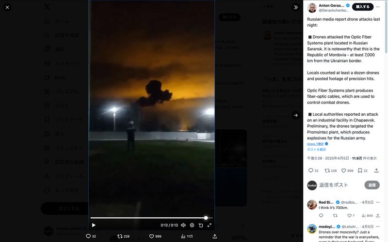 ウクライナ軍は、ロシア国内にある光ファイバードローンの部品工場に長距離攻撃ドローンを送り込み爆破(Xのスクリーンショット)