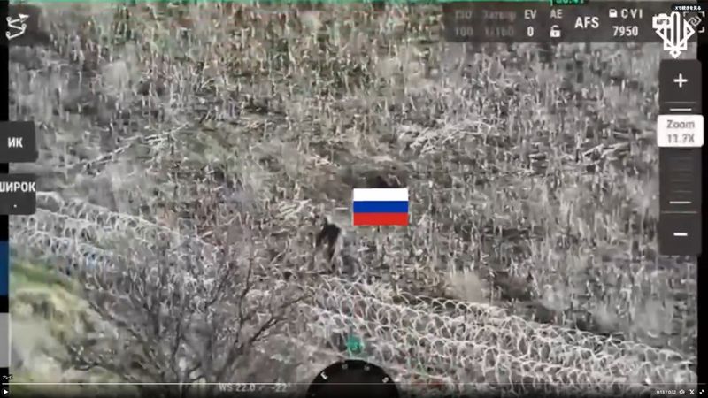 ウクライナ東部ドネツク州ポクロウシク方面で、杖をついてウクライナ軍の陣地へ前進しようとするところとされるロシア兵(Xのスクリーンショット)