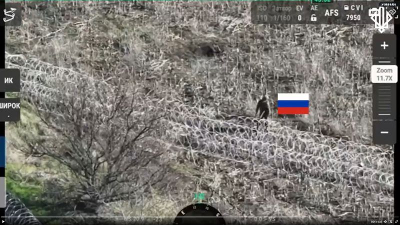 ウクライナ東部ドネツク州ポクロウシク方面で、杖をついてウクライナ軍の陣地へ前進しようとするところとされるロシア兵(Xのスクリーンショット)