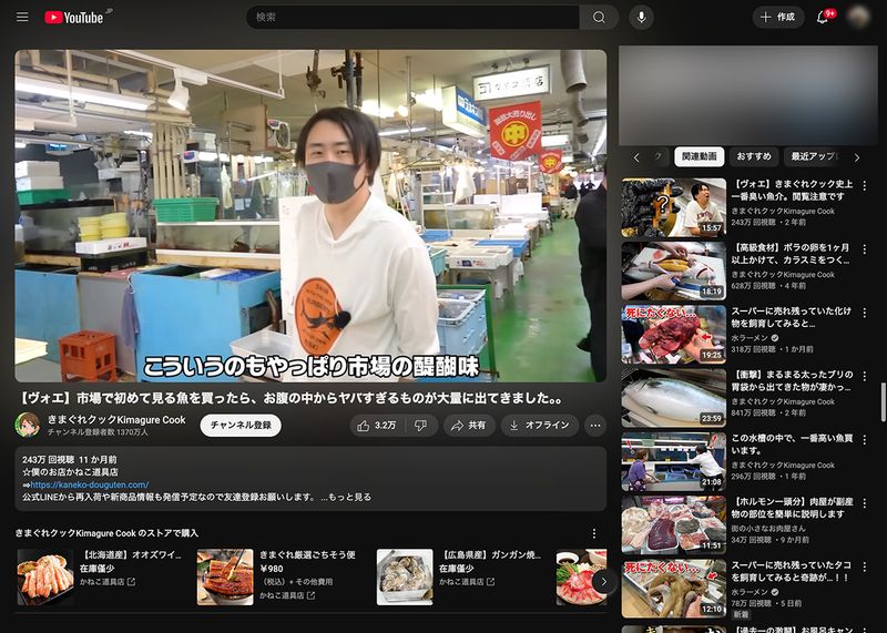 日本のYouTuber、かねこ氏のチャンネル「気まぐれクック」。自身が企画開発する調理器具や推薦する食材などを販売するECストア「かねこ道具店」がYouTubeショッピングと連携している