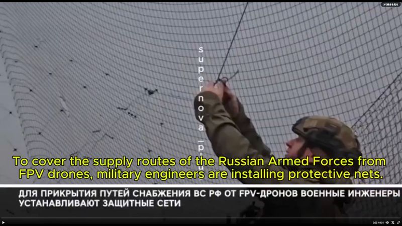 ロシア軍とウクライナ軍の両軍はさらに、最も攻撃を受けやすい補給ルートに、何kmにもわたって、ドローンを捕捉するための網も張っている(Xのスクリーンショット)