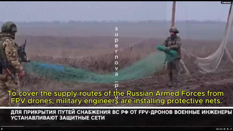ロシア軍とウクライナ軍の両軍はさらに、最も攻撃を受けやすい補給ルートに、何kmにもわたって、ドローンを捕捉するための網も張っている(Xのスクリーンショット)