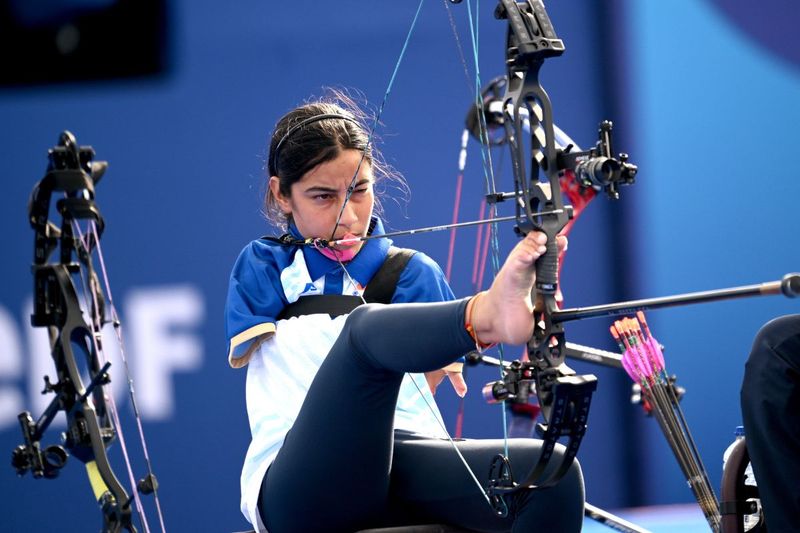 2024年のパリ・パラリンピックで、アーチェリー混合コンパウンド団体に出場したインド代表のシータル・デヴィ(Ramsey Cardy/Sportsfile via Getty Images)