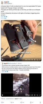 散弾銃の銃身2丁を備えたドローンが、主に爆弾搭載型のクワッドコプターを撃ち落とす(Xのスクリーンショット)