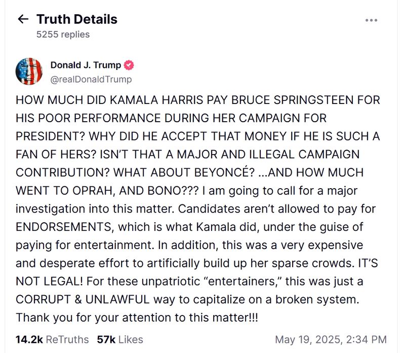 トランプ米大統領は、ロック歌手のブルース・スプリングスティーンをはじめ、ビヨンセなどのスターたちが、2024年大統領選でカマラ・ハリス前副大統領への支持を表明することへの見返りとして報酬を受け取った可能性があると、根拠を示さずに主張した(トゥルース・ソーシャルのスクリーンショット)