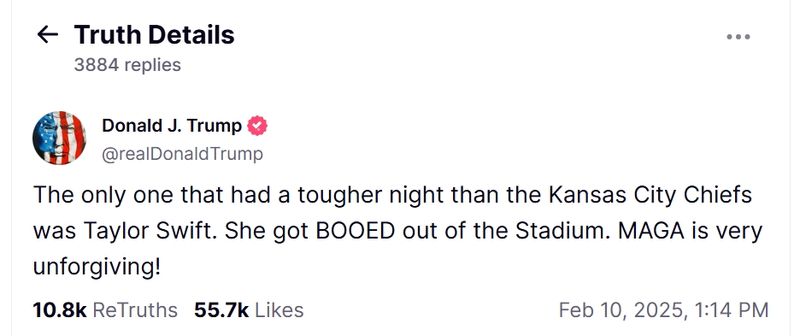 2月にトランプ米大統領は、スーパーボウルの試合中に、一部の観客がスクリーンに映し出されたテイラー・スウィフトの映像にブーイングを送ったことを嘲笑する投稿を行っていた(トゥルース・ソーシャルのスクリーンショット)