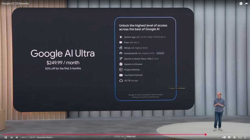 Google I/O 2025で、新たなサブスクリプションとして、月額19.99ドル(約2898円。1ドル=145円換算)の「Google AI Pro」、月額249.99ドル(約3万6000円)の「Google AI Ultra」が発表された(YouTubeのスクリーンショット)