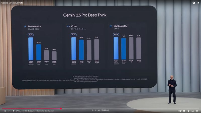 Gemini 2.5 Proの「Deep Thinkモード」について、社内ベンチマークでは、OpenAIのGPT-4をいくつかのソフトウェア開発テストで上回ったと紹介した(YouTubeのスクリーンショット)