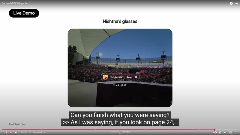 「Android XR」プラットフォームのトピックでは、サムスンが近日発売予定のProject Moohanのヘッドセットやスマートグラスを紹介。スマートグラスのライブデモを実施した(YouTubeのスクリーンショット)