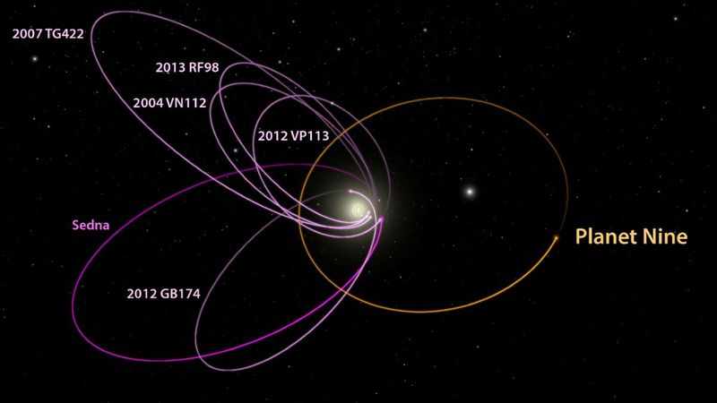 海王星より遠くを公転する6つの太陽系外縁天体の楕円軌道の向きの不自然な偏りと、予想される「第9惑星」の公転軌道を示した図(PL-Caltech/R. Hurt)