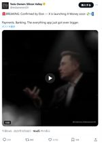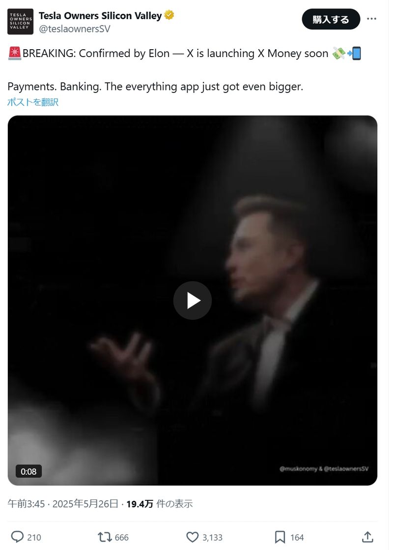 フォロワー数が約120万人の広く知られたアカウントの「Tesla Owners Silicon Valley」が、このリポストに注目し、「速報:Xが間もなくXマネーを立ち上げようとしていることを、マスクが認めた」と投稿(Xのスクリーンショット)