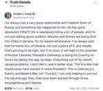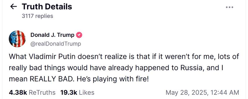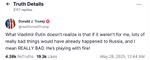 トランプ大統領は自身が創設したSNSのトゥルースソーシャルに「ウラジーミル・プーチンが気づいていないのは、もし私がいなかったら、ロシアにはすでに非常に悪いことがたくさん起こっていただろうということだ」と投稿(トゥルースソーシャルのスクリーンショット)