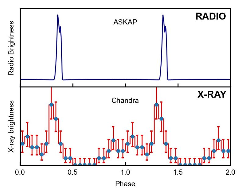 新たに発見された長周期電波トランジェント(LPT)天体「ASKAP J1832-0911」のパルスが電波(上)とX線(下)の両帯域でどのように現れるかを示した光度曲線(Ziteng (Andy) Wang, ICRAR)