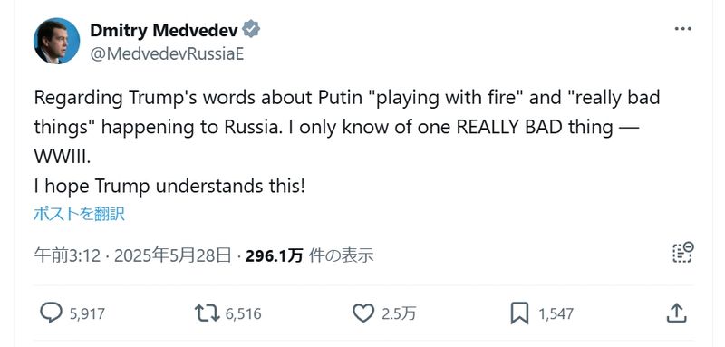 プーチン大統領側近のドミトリー・メドベージェフ副議長が、トランプ大統領の一連の投稿に反応。X(旧ツイッター)に「プーチンが『火遊び』をしており、ロシアに『本当に悪いこと』が起きるというトランプの発言について。私が知っている本当に悪いことは、第三次世界大戦だけだ。トランプがこれを理解しているよう願っている!」と投稿した(Xのスクリーンショット)