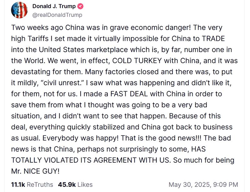 トランプ大統領は「中国は、いつものことかもしれないが、我々との合意を完全に破った」と、その具体的な内容には触れずに主張した。彼はまた、「親切にしてやるのはもうやめた!」と述べて、報復措置を示唆した(トゥルース・ソーシャルのスクリーンショット)