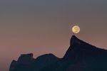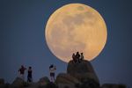 米カリフォルニア州のジョシュアツリー国立公園で、奇岩の背後に昇る満月と記念撮影をする観光客。2012年6月3日撮影(Joshua Tree National Park, Public domain, via Wikimedia Commons)