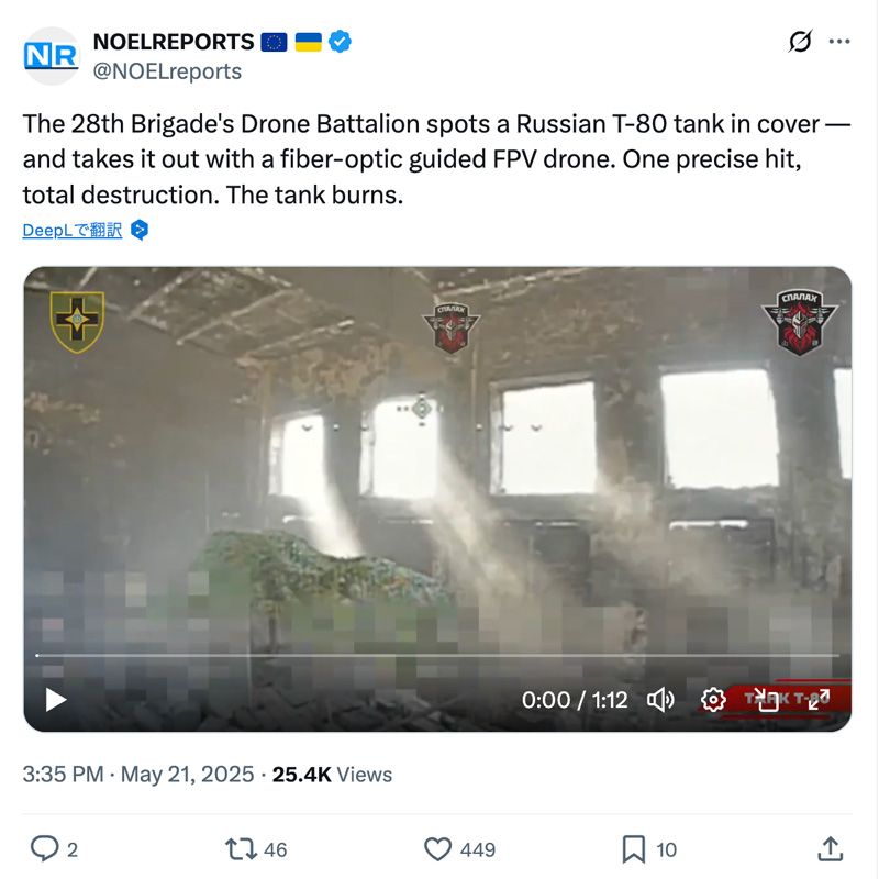 ウクライナ軍の光ファイバードローンは、無線式ドローンでは困難だった建物内に窓や入り口などの開口部から侵入し、隠されている車両を破壊している(Xのスクリーンショット)