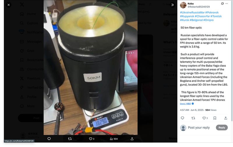 長距離飛行を可能にするロシア軍の50kmの光ファイバーケーブルを巻いたというスプール。重さは4kg弱とされ、爆弾搭載量を減らした大きめのドローンなら取り付けられるだろう(Xのスクリーンショット)