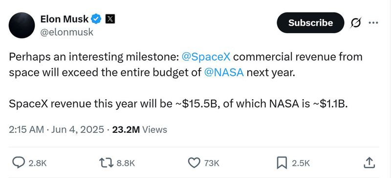 マスクはトランプとの言い争いのなかで、「スペースXの売上高は来年、NASAの年間予算(188億ドル)を超える」ともポストした。非公開企業である同社の今年度の収益見込みが155億ドルであることを明かした