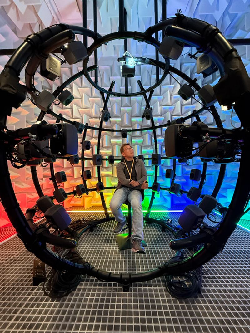 球体のフレームに50個のスピーカーを配置し、世界中の様々な場所の環境音を再現できるようにした評価室。アップルは世界中の様々な場所や多様な環境で64個のマイクを使って収録した環境音をここで再生し、あらゆる場所における機械学習を行えるようにしている