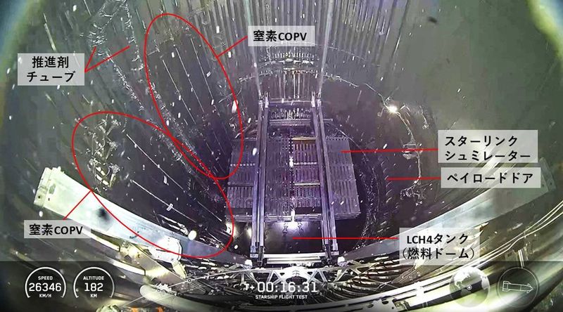 IFT9のスターシップの内部画像。画面左手に黒い窒素COPVが複数本並んでいる。その間にはヘッダータンクから延びる推進剤のチューブ2本が見える(C)SpaceX/Yoshio Suzuki