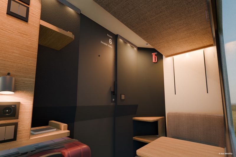 ダブルビスタルームは、2つのベッドを格納すると椅子とテーブルが使用できる(Nox Mobility)