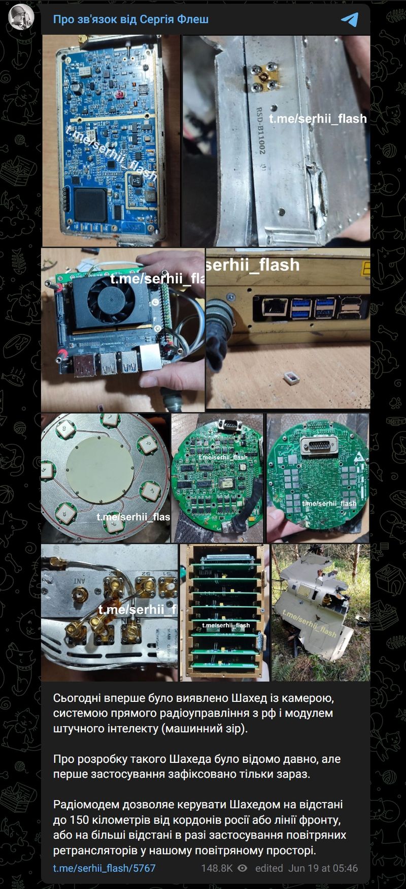 シャヘドは商用AI(人工知能)プロセッサーで動作するカメラ・マシンビジョンシステムも搭載するようになっている。ウクライナの電子戦専門家セルヒー・「フレシュ(フラッシュ)」・ベスクレストノウが6月18日、自身のテレグラムチャンネルに画像付きで詳しい情報を投稿し、事実と確認された(Xのスクリーンショット)