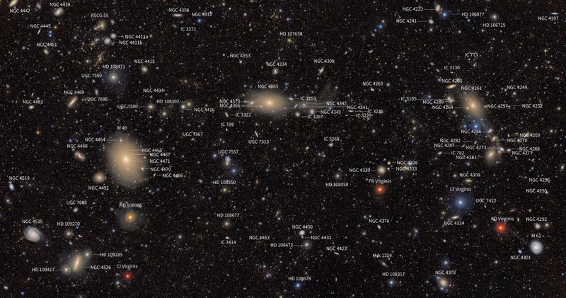 ベラ・C・ルービン天文台が撮影したおとめ座銀河団の全体像に注釈を加えた画像。一見何でもないような宇宙空間も、ルービン天文台の目を通せば、きらびやかなタペストリーへと一変する。2025年6月5日作成(NSF–DOE Vera C. Rubin Observatory)