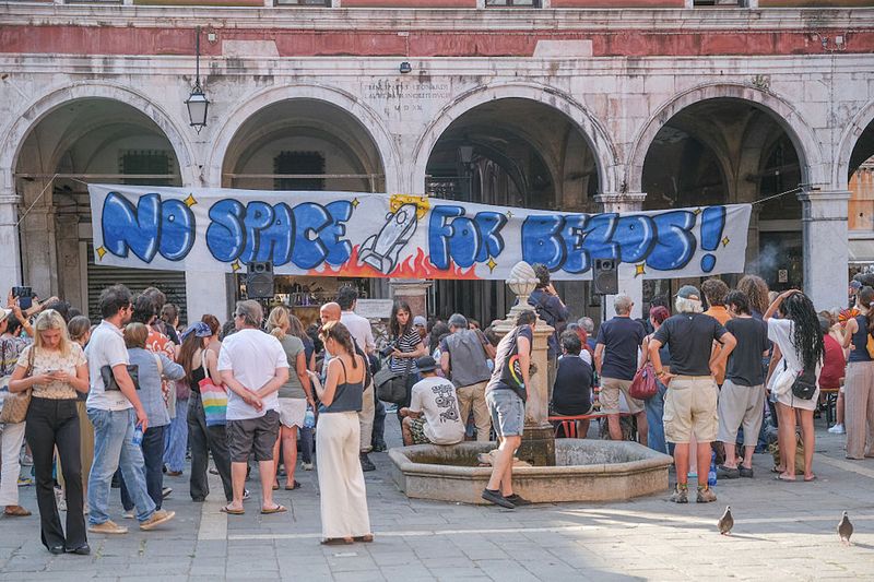 2025年6月13日、結婚式に反対する抗議行動を組織するため、「No Space For Bezos」活動家たちが集まる様子。(Photo by Stefano Mazzola/Getty Images)