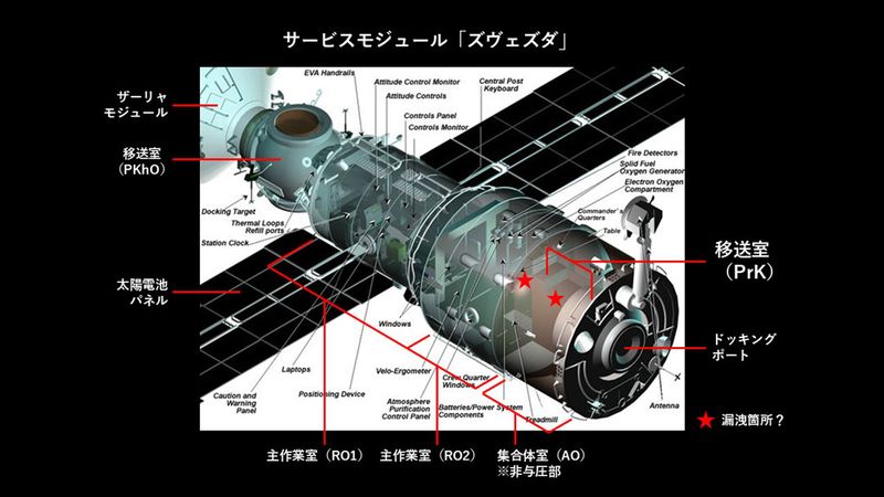 ズヴェズダのスケルトン図。右の船尾にドッキングポートがあり、そこからトンネル状の移送室「Prk」が続く(C)NASA/Yoshio Suzuki