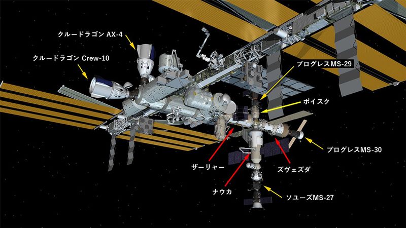AX-4の宇宙船クルードラゴンが接続した6月26日以降のISS。赤い矢印はISSモジュール、黄色は宇宙船と無人輸送機を示す(C)NASA/Yoshio Suzuki