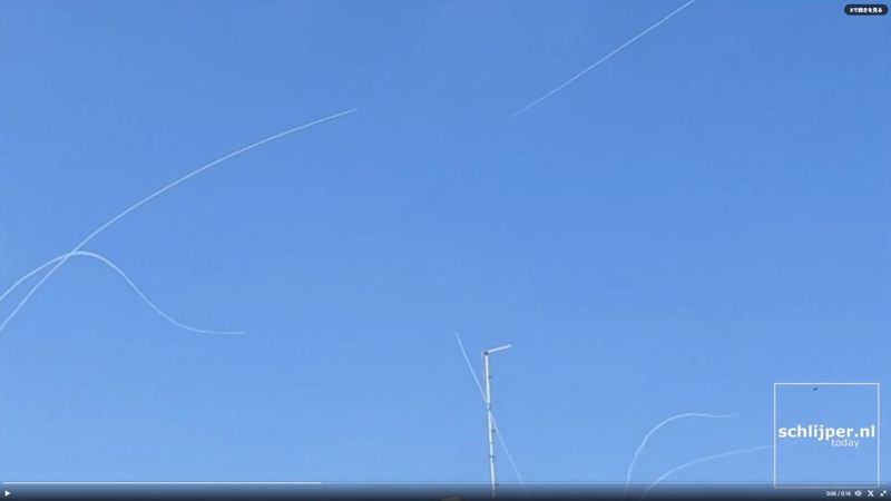 ある映像には、目標に向けて急降下してくる弾道ミサイルに、アイアンドームの比較的低速な迎撃ミサイル「タミル」が巧みに進行方向を変えて向かっていき、破壊する様子が映っている(Xのスクリーンショット)
