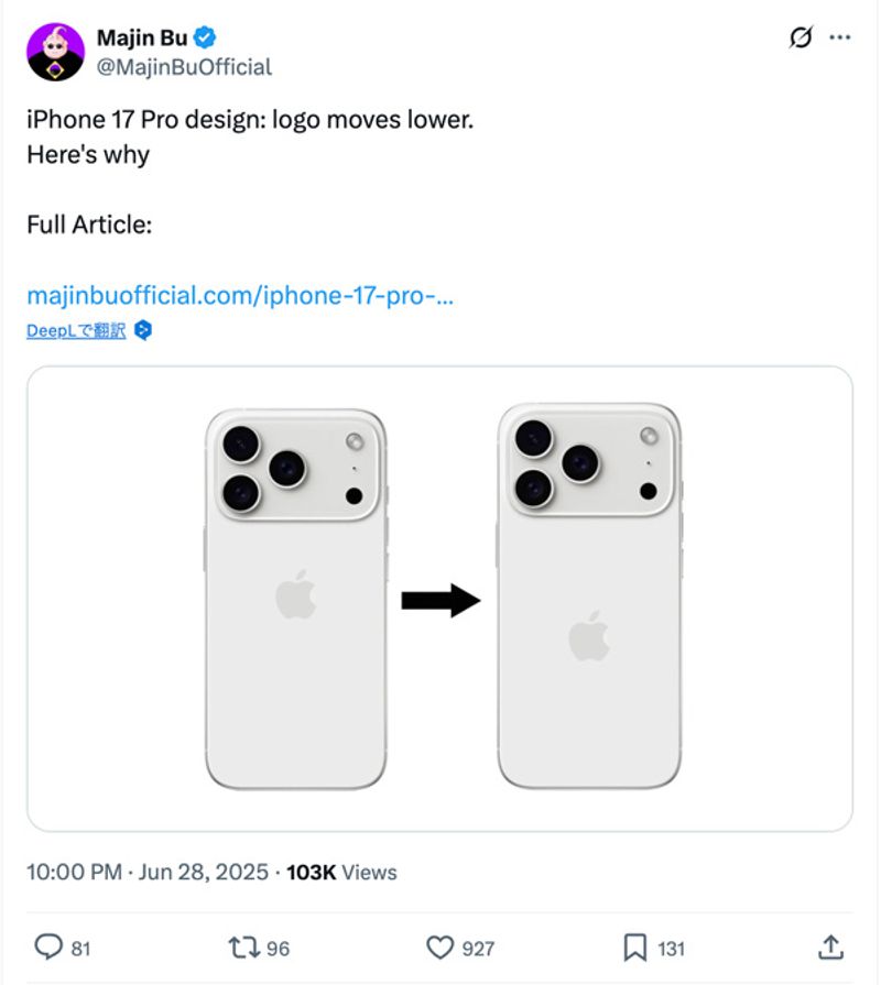 次世代iPhoneでは背面のアップルマークが下に移動するという(Xのスクリーンショット)