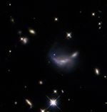 超新星残骸SNR 0509-67.5内のカルシウムの分布を示す画像。欧州南天天文台(ESO)の超大型望遠鏡VLTに搭載の超広視野面分光装置MUSEでデータを取得。画像に重ねて表示した2本の曲線は、数百年前に核融合を終えた恒星から2回の爆発で放出された同心円状の2つのカルシウムからなる球殻の輪郭を示している(ESO/P. Das et al.)