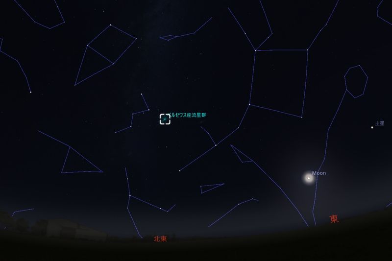 2025年7月18日(東京:午前0時ごろ)の北東の空、ペルセウス座流星群の放射点の位置(Stellarium)