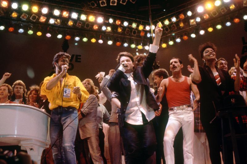 ジョージ・マイケル、U2のボノ、クイーンのフレディ・マーキュリーなど、グランドフィナーレのステージに登場したスターたち(Kent Gavin/Mirrorpix/Getty Images)