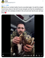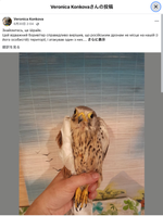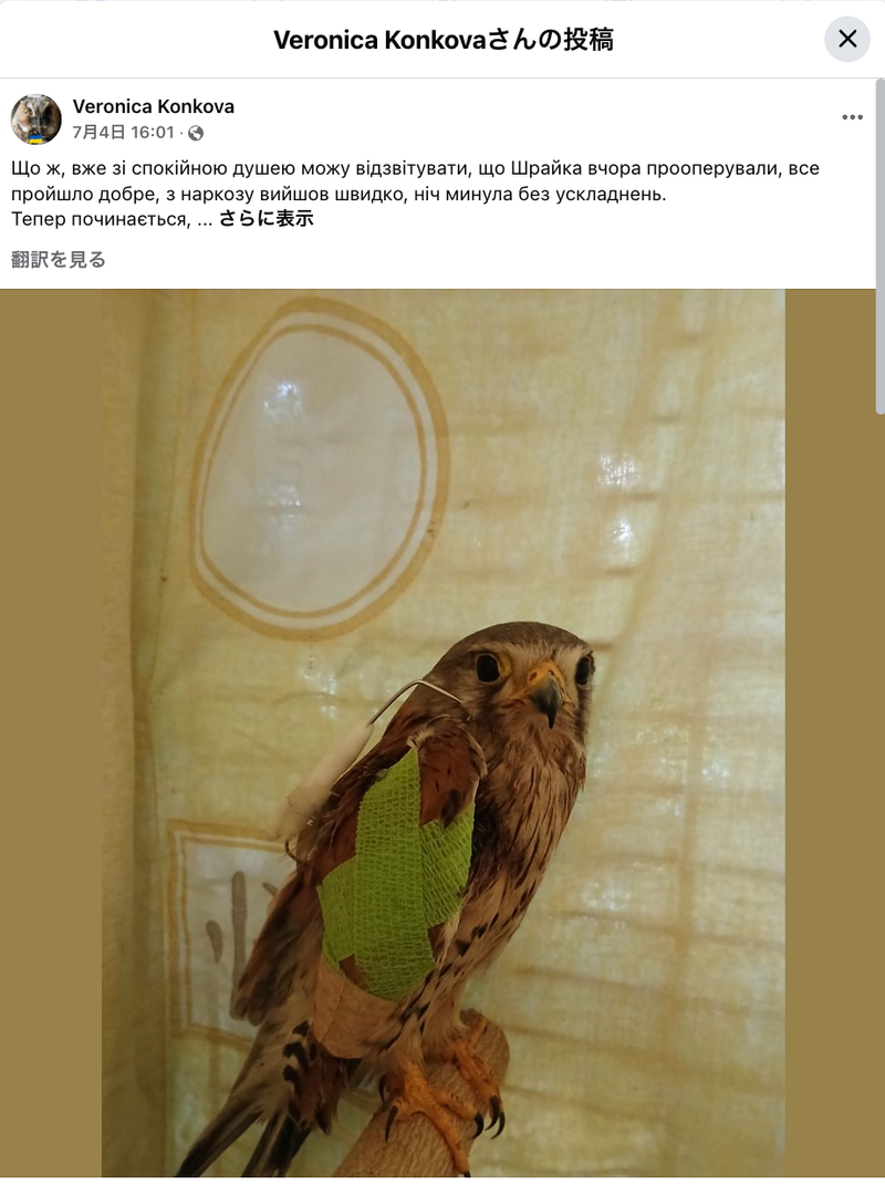 ロシアのドローンと戦い翼が折れたとされるチョウゲンボウの「シュライク」(戦闘地域で傷ついた鳥を救助する活動に携わるベロニカ・コニコバのFacebookより)