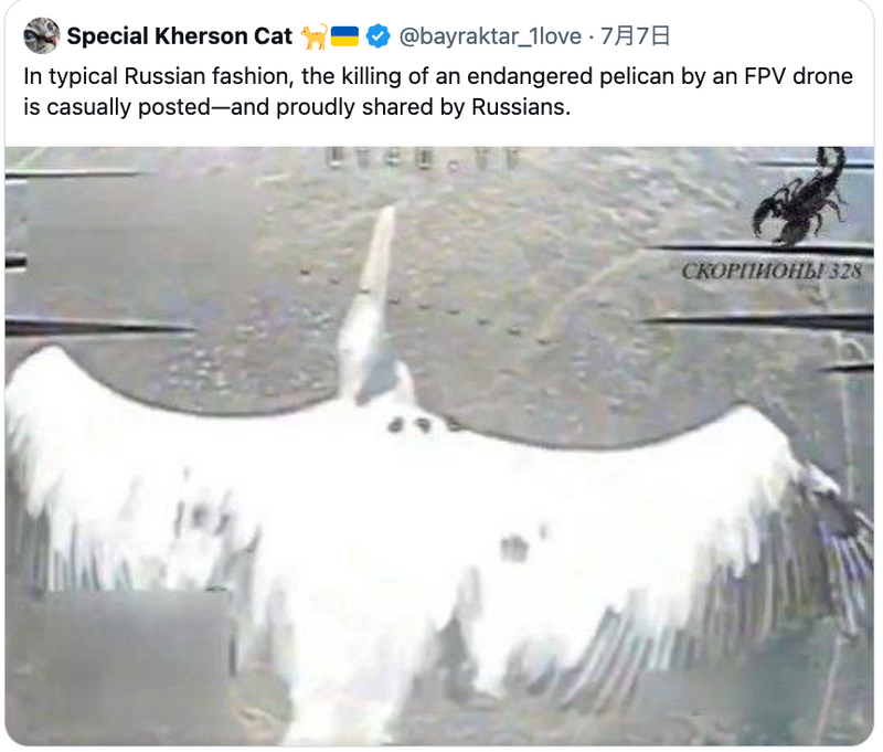 ロシア軍のドローン(無人機)がニシハイイロペリカンとされる大型鳥を攻撃する直前の様子(X投稿動画より)