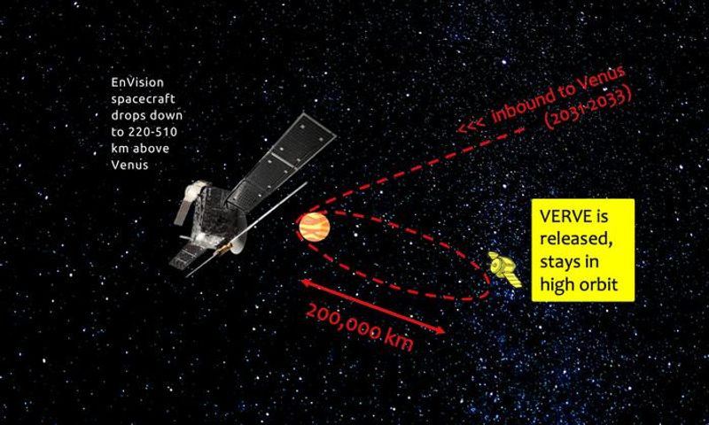 VERVE金星探査計画の説明イラスト。キューブサットサイズのVERVE探査機はESAのEnVision探査機に相乗りして金星に到着した後に切り離され、独自の調査を実施する(Professor Jane Greaves)
