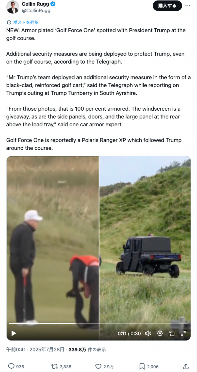 スコットランドのゴルフ場に現れたトランプ大統領一行用の「特別車両」背面(X投稿より)