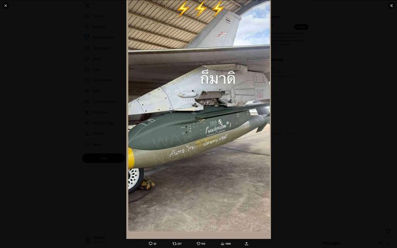 空爆で使用されたタイ空軍のF-16戦闘機とその兵装(Xのスクリーンショット)