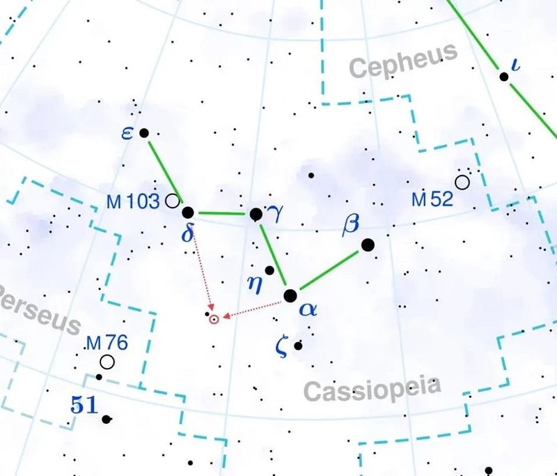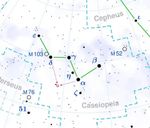 銀河系で最古級の肉眼で見える恒星カシオペヤ座ミュー星(Mu Cas A)の位置を示した星図。北天の星座カシオペヤ座(W字)の外側の2本の腕を伸ばして交差したところ(赤丸の中心)にある(Wikipedia)