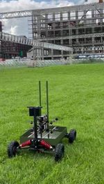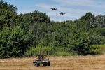 ウクライナ企業IRVが公開した無人車両「カラクルト」。カラクルトは上部の2つの発射レールにFPVドローンを各3機、合計で6機搭載可能だ(Xの画像より)