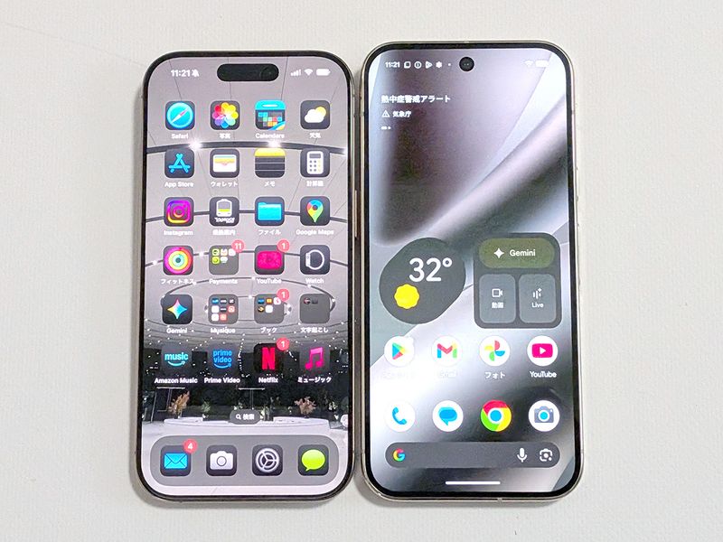 6.3インチのPixel 10 Pro(左)と同じ6.3インチのiPhone 16 Pro(右)を並べて比較。Pixelの方が横幅がスリムで縦に長いデザインだ