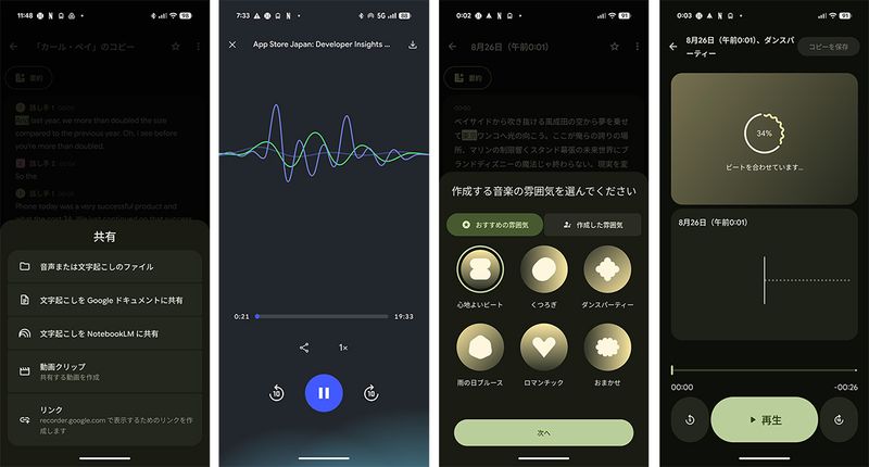 ビジネスシーンにも役立つPixel純正のレコーダーアプリに新機能が加わった。左はNotebookLM連携。文字起こしのテキストをNotebookLMに送り出して「音声解説」を生成できる。右は録音した音声にBGMを生成してバックグラウンドで再生するユニークな機能