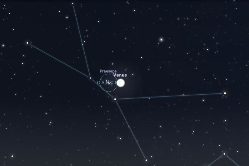 2025年9月1日(東京:午前3時45分ごろ)の東の空、金星とプレセペ星団の位置関係(Stellarium)