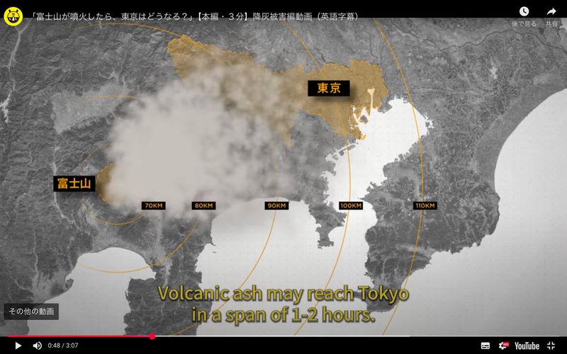 富士山で大規模な噴火が東京の都市インフラに及ぼす影響(YouTubeのスクリーンショット)