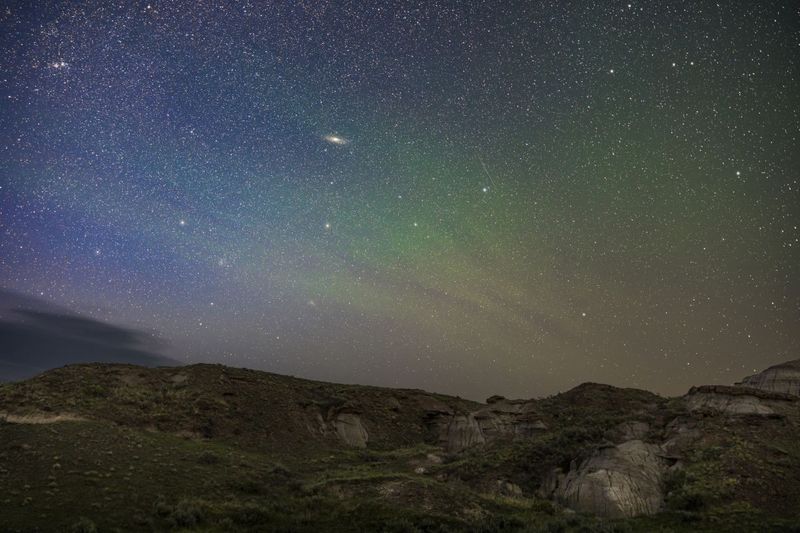 カナダ・アルバータ州の恐竜州立公園(ダイナソール州立公園)から見上げた「ペガススの大四辺形」(写真右側)とアンドロメダ座、アンドロメダ銀河(M31)の眺め(Alan Dyer/VW Pics/Universal Images Group via Getty Images)