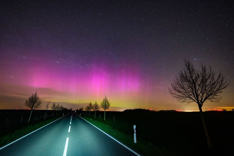 ドイツ・ブランデンブルク州ファルケンハーゲンで2025年4月16日に撮影されたオーロラ(Patrick Pleul/picture alliance via Getty Images)